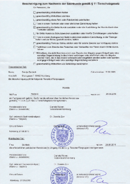 Bescheinigung gem. § 11 Tierschutzgesetz